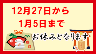 本年中は誠に有難う御座いました。 12月27日~1月5日までお休みとなります。 来年も変わらぬご愛顧賜ります様、宜しくお願い申し上げます。